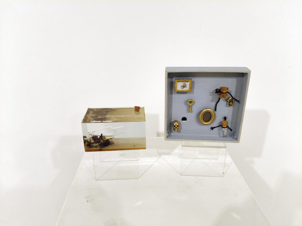 Bastidor 13 x 13 x 2 cm. Caja de fibrofácil, marcos acrílicos, dijes de metal, oso miniatura, gotas acrílicas de strass, espejo, topes de silicona, botella de vidrio y corcho. Cartón y papel obra, hilo de poliéster y de algodón. Pintura a la tiza, esmalte de uñas.